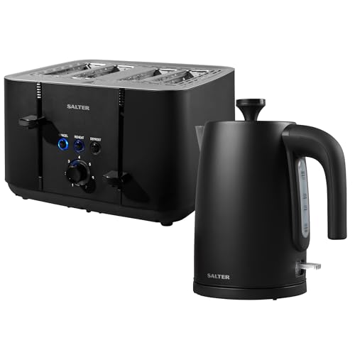 Salter COMBO-8824 Kuro Kettle and Toaster Set – Black 1.7L Capacity Fast Boil Kettle with Limescale Filter, 4-Slice Self-Centring Anti-Jamming Electric Toaster, Defrost/Reheat/Cancel, 3kW/1850W