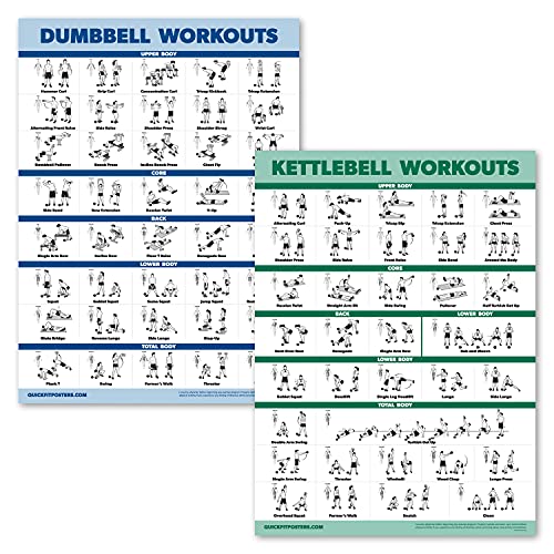 QUICKFIT Dumbbell Workouts and Kettlebell Exercise Poster Set - Laminated 2 Chart Set - Dumbbell Exercise Routine & Kettle Bell Workouts - (18" x 24")