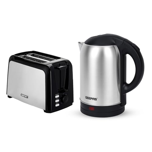 Geepas 2 Slice Bread Toaster & 1.8L Electric Kettle Kitchen Combo Set | 750W Toaster, 7 Level Browning Control, Defrost, Reheat & Cancel Function | 1800W Stainless Steel Cordless Jug Kettle