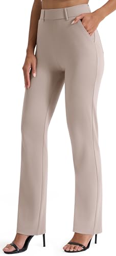 AFITNE Straight Leg Work Trousers for Women UK - Ladies Business Office Casual Bootcut Flared Yoga Pants Pull On Womens Smart Trousers with Pockets - 31 Inches Light Khaki M