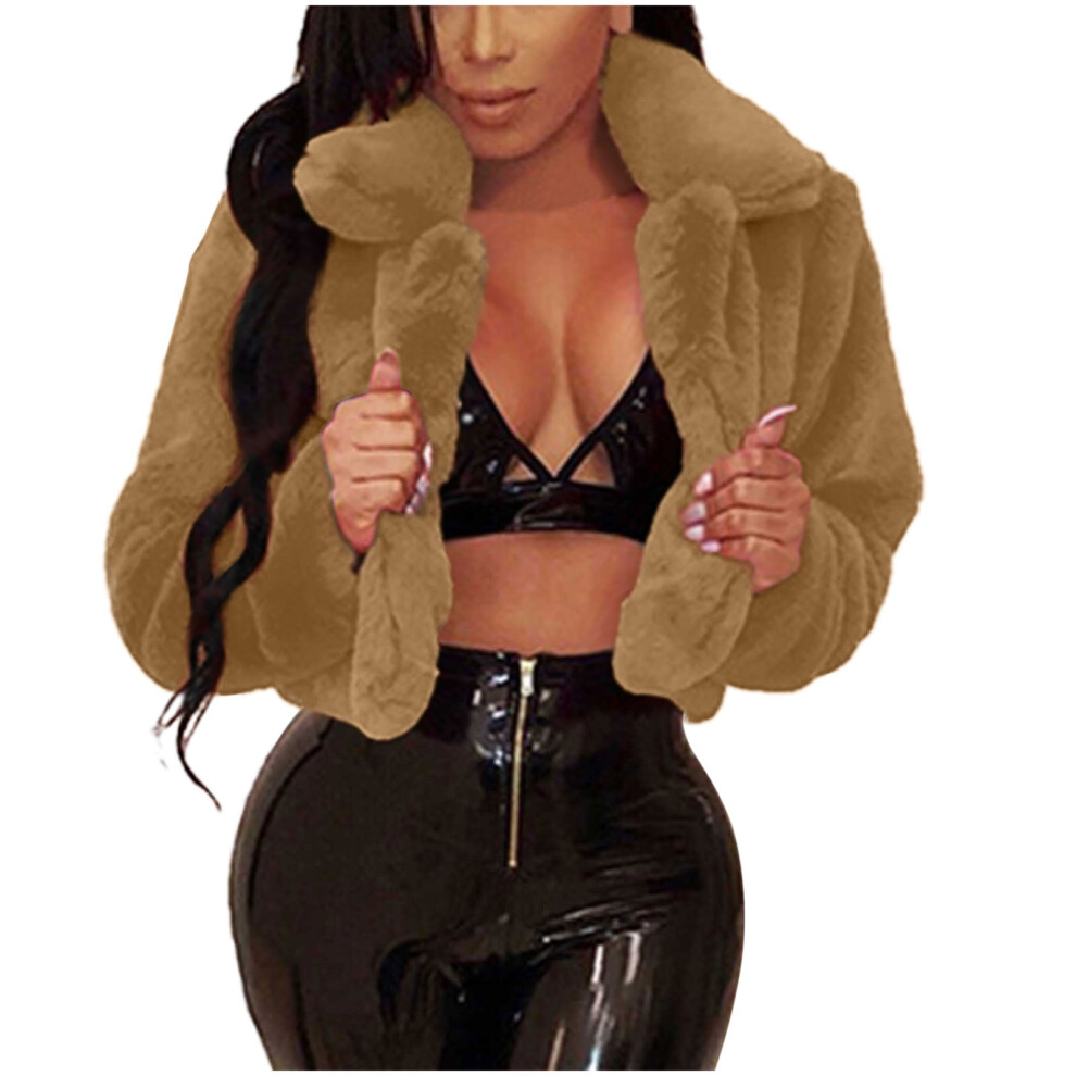 VERUGU Womens Jackets Casual Cropped Faux Fur Coat Parka Shaggy Coat Fall Winter Long Sleeve Outerwear Fluffy Solid Jackets Khaki L