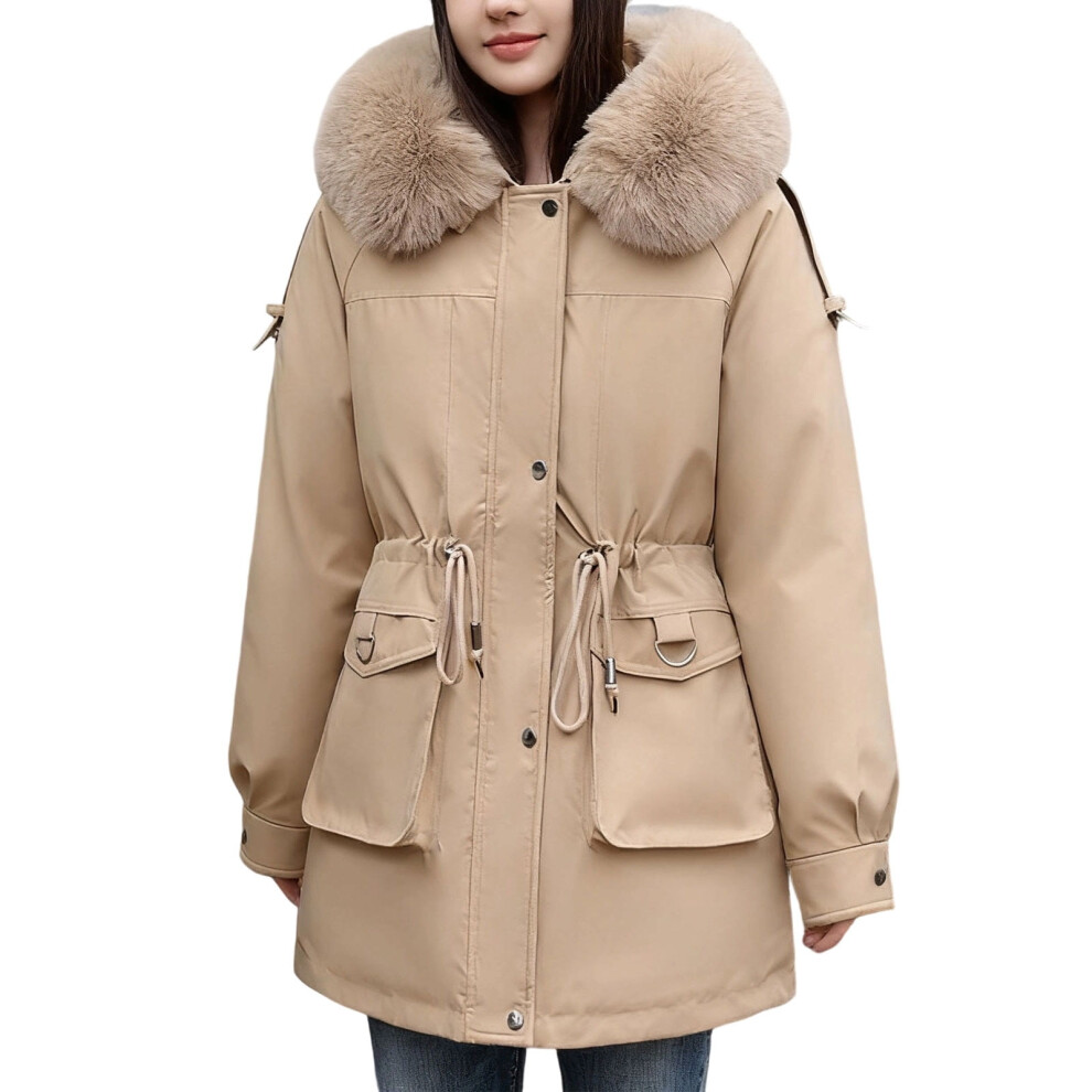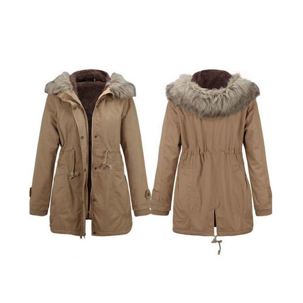 (Khaki, L) Womens Winter Windbreaker Jacket Parka Hooded Outdoor Hoodie Coat Fur Linling