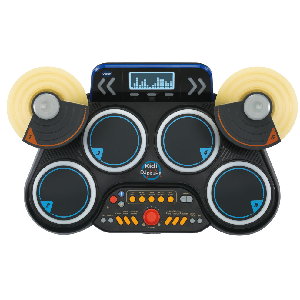 VTech Kidi DJ Drums, Light-up Electronic Drum Kit for Kids, with 4 Drums, 2 Cymbals, Drum Sticks, Bluetooth, Coach Mode and More, Music Toy for Ages