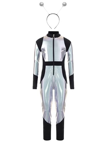 Yyuihri Girls Kids Alien Costume Silver Metallic Alien Jumpsuit Halloween Costume Masquerade with Hair Hoop Silver 9-10 Years