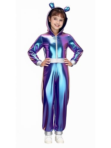 Rswnyirn Kids Girls Alien Costume Outer Space Cutie Costume Halloween Robot Fancy Dress Metallic Gloss Hood Jumpsuit Colorful 9-10 Years