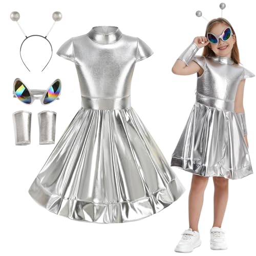 maxToonrain Kids Alien Costume Set for Girls, Alien Dress with Backpack, Sunglasses, Headband, Halloween Cosplay Outfit for Child (Silvery, 6-7 years)