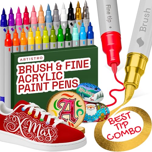 ARTISTRO 24 Acrylic Paint Pens – Dual Tip (Brush & Fine) Markers, Multicolor for Fabric, Canvas, Rock, Glass, Wood & Paper – Great DIY & Gift for Kids, Teens - Art Set