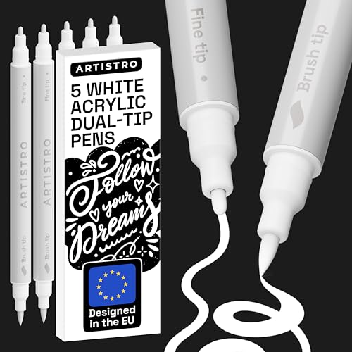 ARTISTRO 5 White Acrylic Paint Pens – Dual Tip (Brush & Fine) Markers, Multicolor for Fabric, Canvas, Rock, Glass, Wood & Paper – Great DIY & Gift for Kids, Teens - Art Set