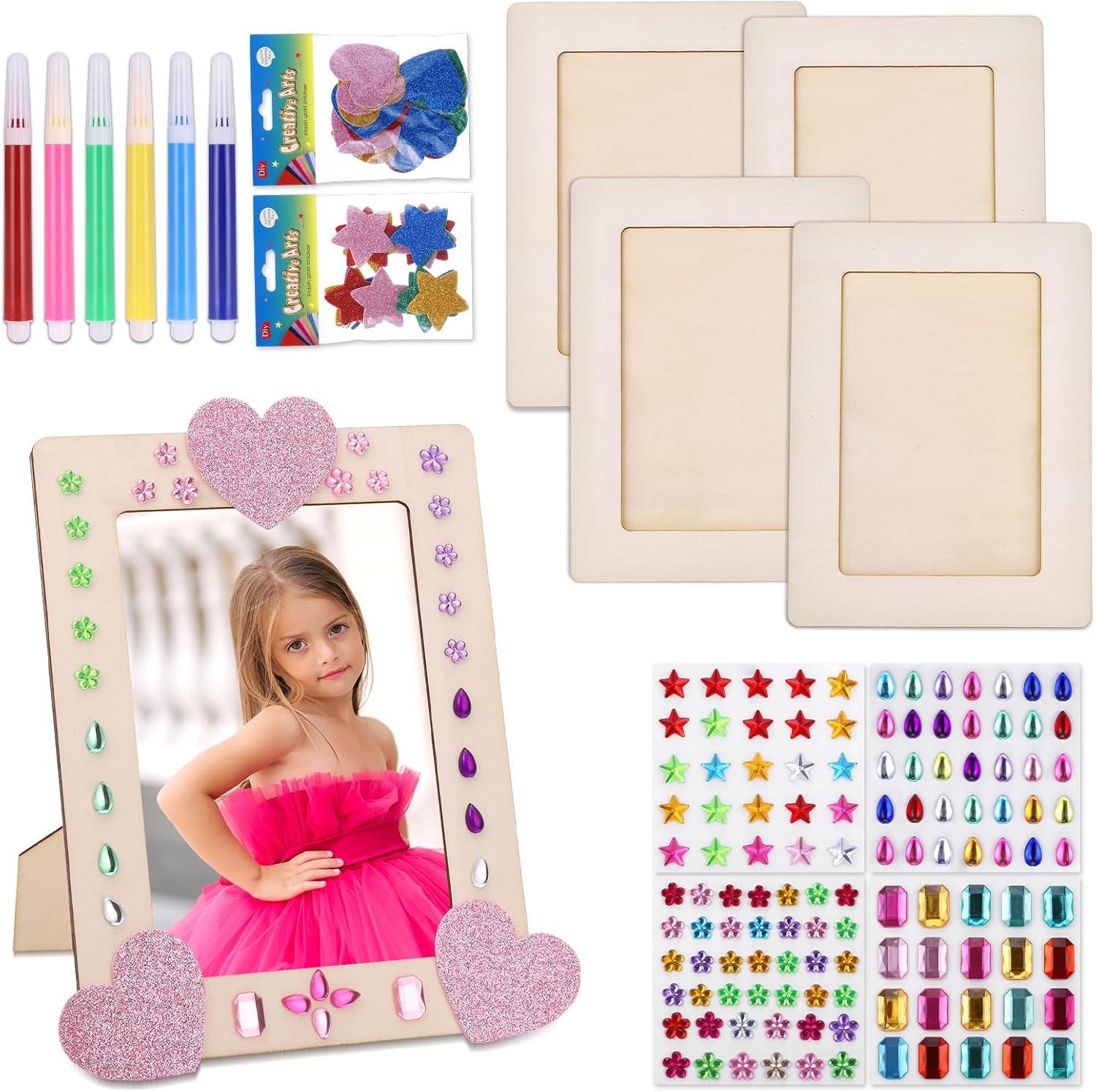 Fentar DIY Kids Photo Frame, 4Pcs Wooden Kids Art Frame Set with Glitter Stickers and Color Pens, Craft Photo Frames to Decorate, Paint Your Own Sets Picture Frames Kits DIY Craft for Kid Gift