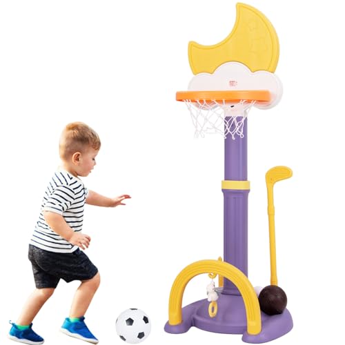 COSTWAY Kids Basketball Hoop, 4 in 1 Toddler Sports Activity Center with Electronic Scoreboard, Soccer Goal, Ring Toss, Golf Set, Height Adjustable Basketball Stand for Boys Girls (Purple+Yellow)