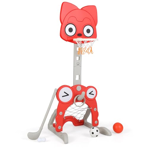 COSTWAY Kids Basketball Hoop, 4 in 1 Sports Activity Center with Football Goal, Golf, Ring Toss, Height Adjustable Indoor Basketball Stand for Toddlers (Fox)