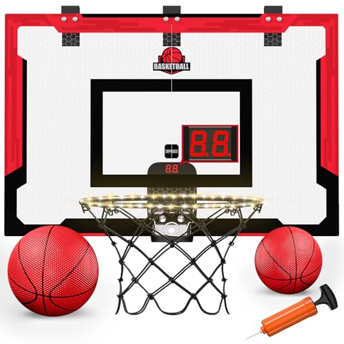 Hot Bee Basketball Hoop Indoor for Kids, Mini Basketball Hoop for Bedroom Door, Basketball Gifts Boys Age 9-13, with 3 Balls Electronic Scoreboard Net Lights