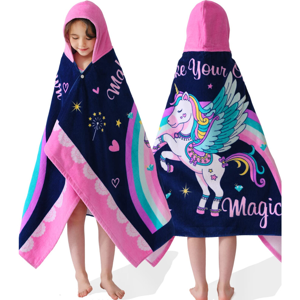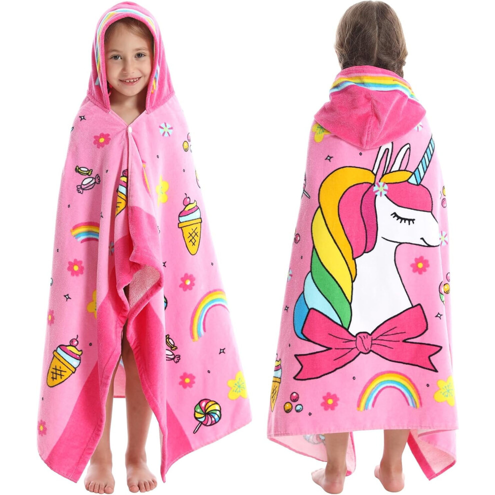 MOKANI Kids Hooded Poncho Towels, Beach Changing Robe Bath Towel Poncho for Swimming Pool, Microfiber Soft and Large Bathrobe for Girls Boys Children 6-14 Years Old - Pink Unicorn