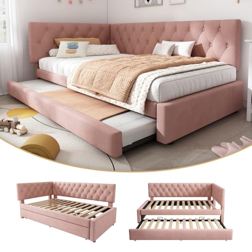 FammyLoft 3ft Single Upholstered Daybed with Velvet L-Shaped Design, Pull out Trundle Bed with Slatted Frame, Convertible Sofa Bed for Adults and Kids, 90 * 190cm, Pink (No Mattress)