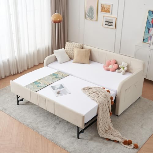 Upholstered 3FT Single Daybed Pink Velvet with Pull-Out Sofa Bed Durable Metal Slatted Frame for Guest Rooms Small Bedrooms Living Spaces Adults Kids (Pull-out Trundle + Beige + 90cm*190cm)