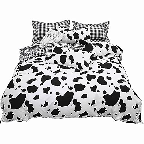 Mengersi Cow Print Comforter Bed Cover Set Full Size Black and White Reversible Plaid Grid Bedding Sets for Kids Girls Boys