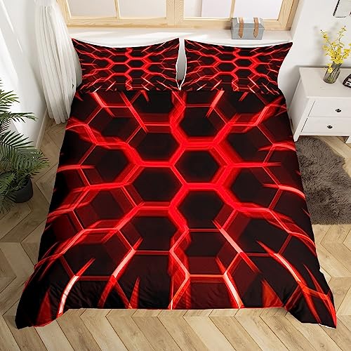 Honeycomb Duvet Cover Black Red Geometric Hexagonal Pattern Gamer Single Bedding Sets for Boys Girls Kids,3D Hexagon Beehive Comforter Cover Game Room Decor,Glowing Neon Home Decor Bed Set