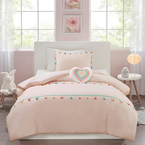 MI ZONE KIDS Queen Comforter Set for Girls, Pink Comforter Set Queen, Tessa Adorable Teen Bedding Sets for Girls, Fun Colorful Pom Pom Tassel, Sham, Boho Heart Throw Pillow, Full/Queen, Blush 4 Piece