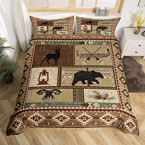 Rustic Cabin Bedding Sets Double Size,Bear Deer Wooden Canoe Pinecone Patchwork Comforter Cover,Southwest Exotic Aztec Duvet Cover for Kids Boys Girls Youth,Rural Farmhouse Lodge Quilt Cover,Soft