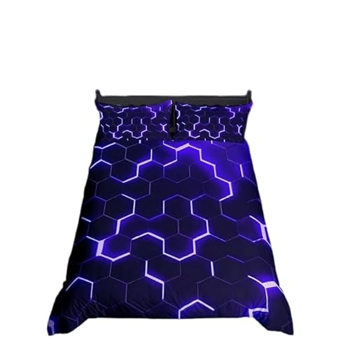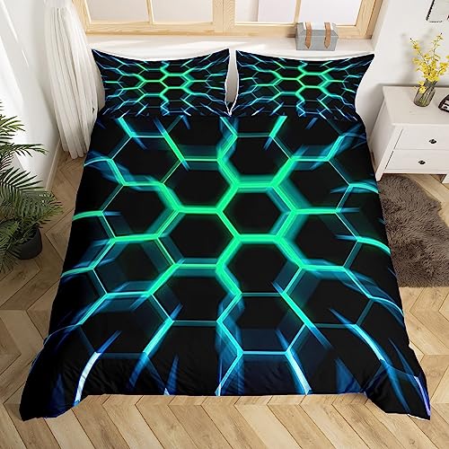 Honeycomb Single Bedding Sets for Boys Kids Black Teal Hexagon Geometrical Duvet Cover,3D Geometric Beehive Pattern Hexagonal Comforter Cover Neon Lights Glowing Bed Set Ultra Soft Room Decor