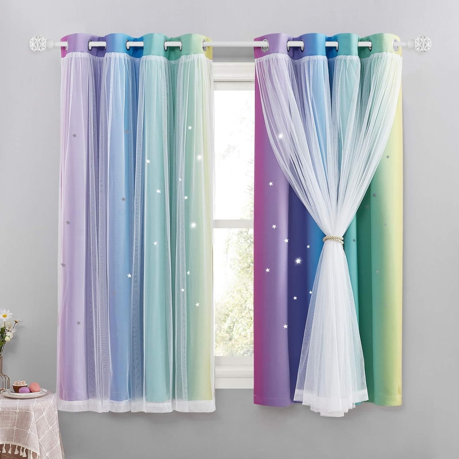 Stiio Kids Blackout Curtains 2 Panels, Star Cutout Ombre Stripe Rainbow Curtains Light Blocking Window Treatment for Girls Bedroom Home Decor, W52 x L63 inches