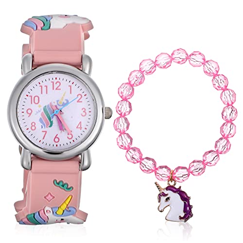 MOKKHNB Unicorn Watch for Kids and Girls Pink Cartoon Kids Watch with Bracelet Set Birthday Toddler Student Timepiece for Everyday Wear