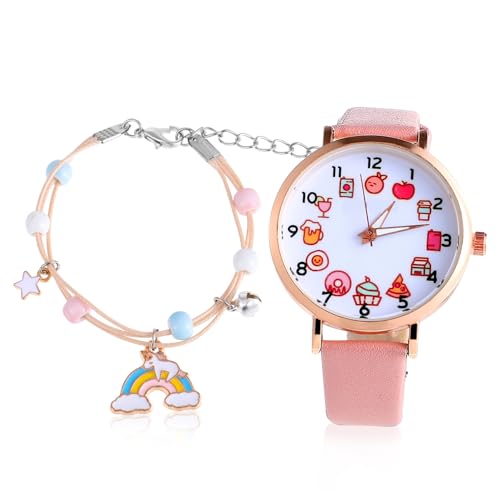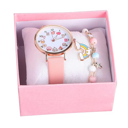VALICLUD Children's Analog Watch and Unicorn Bracelet Set for Girls, Pink Cartoon Fashion Wristwatch Kids Wrist Bracelet, Suitable for Everyday Wear