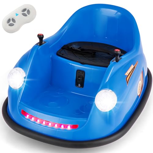 GYMAX Kids Ride On Bumper Car, 12V Battery Powered Toy Car with Remote Control, Joysticks, Lights, Music, Safety Belt & Slow Start, 360° Spin Children Electric Waltzer Car for 2-5 Years Old (Blue)