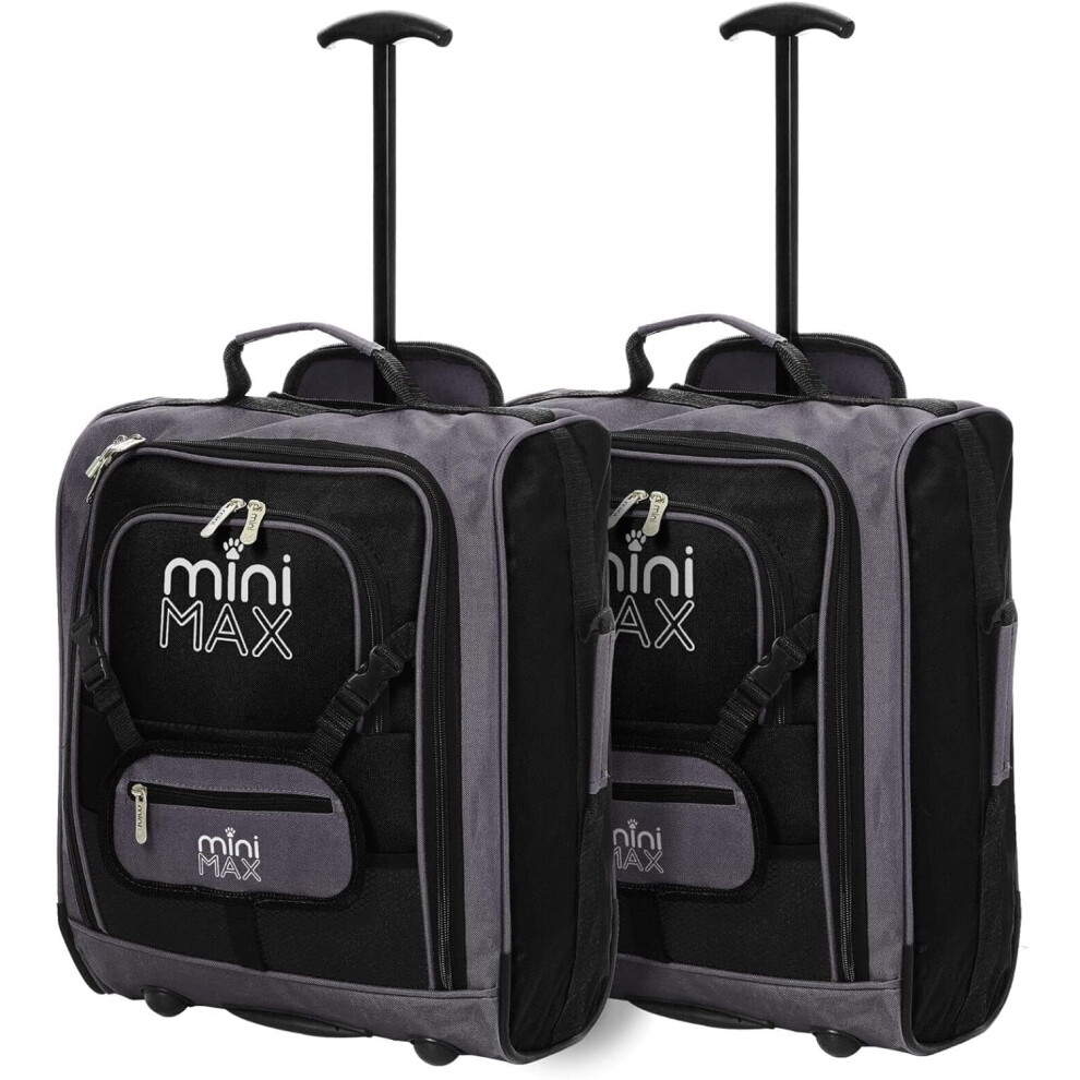 MiniMax Kids Travel Carry On Hand Cabin Luggage Suitcase Trolley Backpack Bag with 2 Wheels with Front Pocket for Toys/Dolls/Teddy Bears, Set of 2, Black