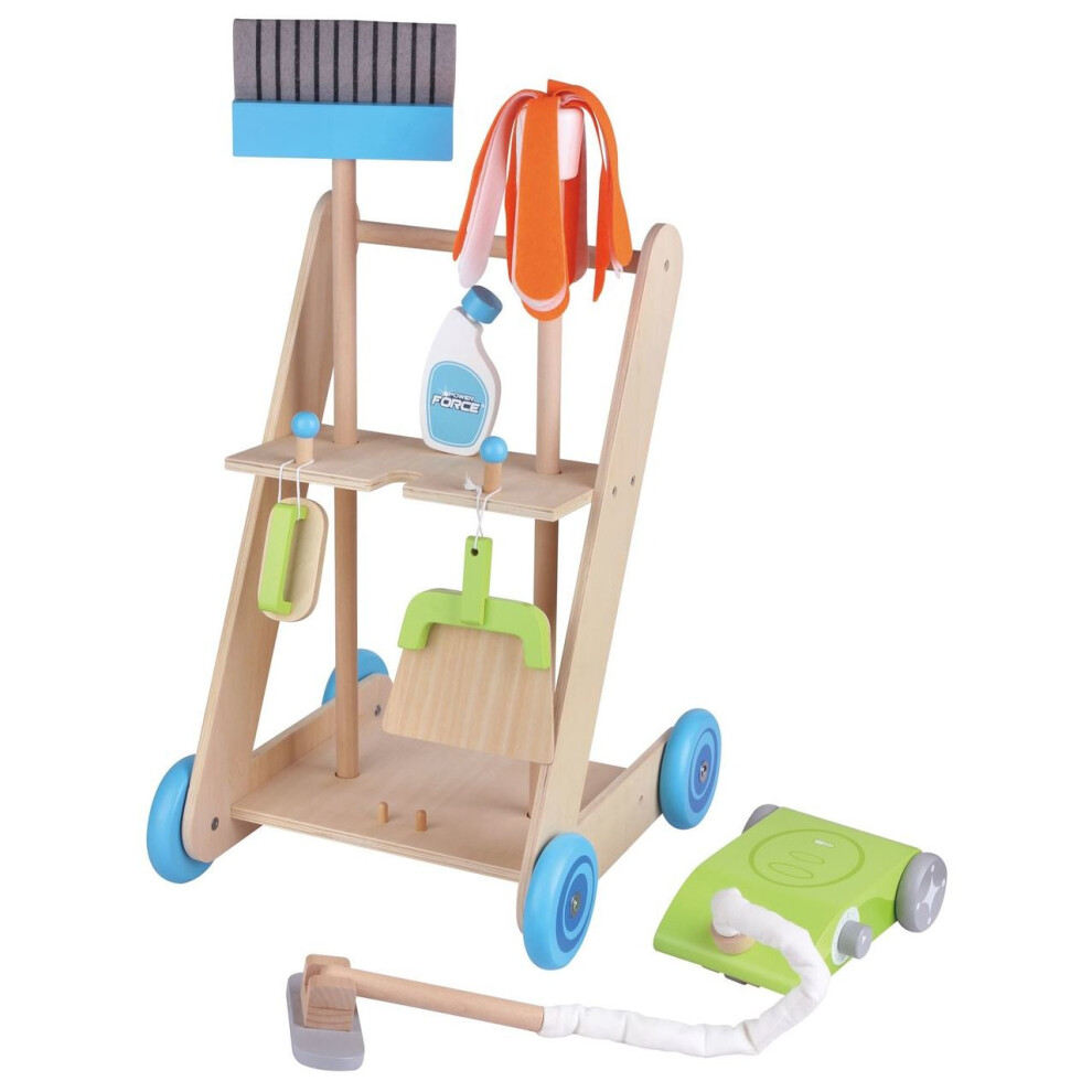 Lelin 11PC Wooden Toy Cleaning Cart Trolley Pretend Play Set for Kids