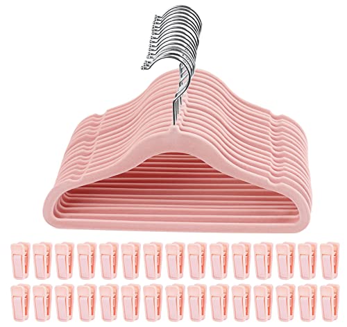 HOUISM Baby Hangers Velvet Pink with 30 Finger Clips, Non-Slip Chirdren Hangers for Clothes Sets, Ultra-Slim Space Saving Kids Hangers, Sturdy&Durable Baby Coat Hangers-15Pack