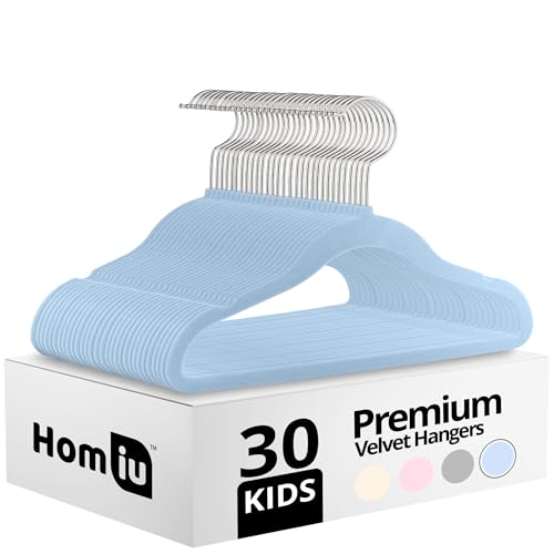 Homiu Non-Slip Kids Velvet Hangers | Ultra-Slim Space Saving Baby Velvet Coat Hangers | 360 Degree Rotatory Hook, Sturdy Baby Clothes Hanger | 30 Pack (Blue, 30 Pack)