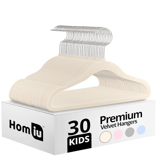 Homiu Non-Slip Kids Velvet Hangers | Ultra-Slim Space Saving Baby Velvet Coat Hangers | 360 Degree Rotatory Hook, Sturdy Baby Clothes Hanger | 30 Pack (Cream, 30 Pack)