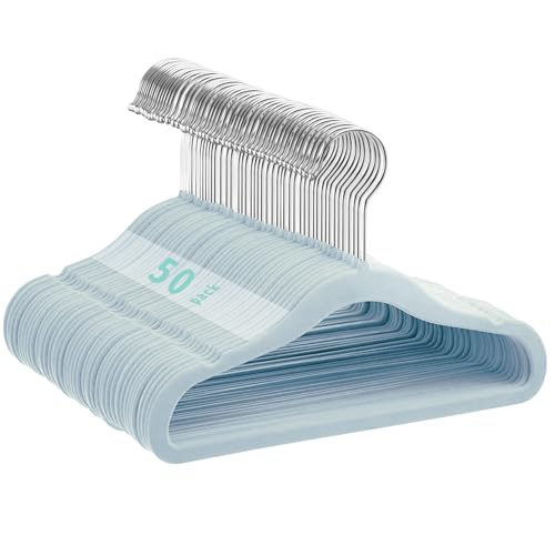 MangoKit Non-Slip Kids Velvet Hangers, Ultra-Slim Space Saving Baby Velvet Coat Hangers,360 Degree Rotatory Hook,Sturdy Baby Clothes Hangers 50 Pack (28cm,Blue)