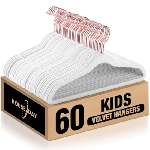 HOUSE DAY Kids Velvet Hangers 60 Pack(14 Inch) - Kids Hangers with Non-Slip and Space Saving for Children, Durable Kids Coat Hanger - Children hanger with 360°Swivel Rose Gold Hook (White)