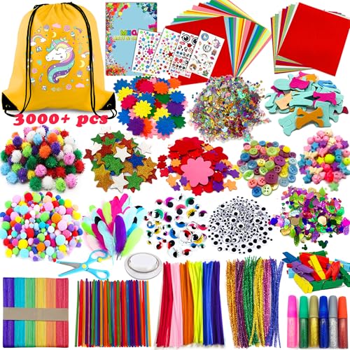 Chennyfun 3000pcs+ Arts and Crafts Supplies for Kids, Craft Art Kits for Toddlers with Unicorn Storage Bag, All in One D.I.Y. Crafting Set Includes Pom Poms, Feathers, Beads, Supply for Kids Ages 4-12