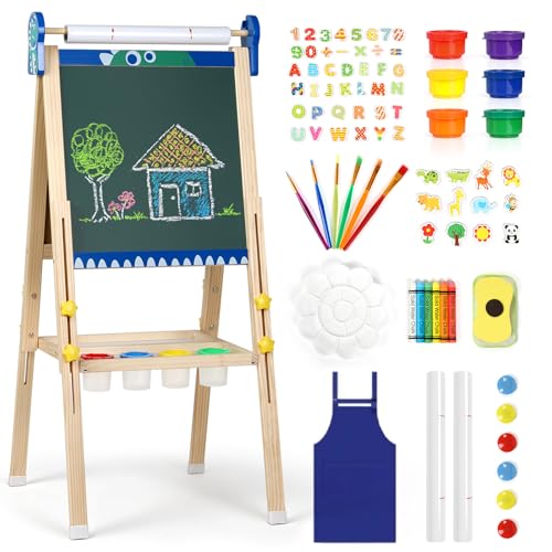 Kids Easel Wooden Art Easel Double-Sided Standing Easels Height Adjustable Painting Drawing Board Chalkboard Blackboard,Whiteboard with Paper Roll Letters Numbers and Other Accessories