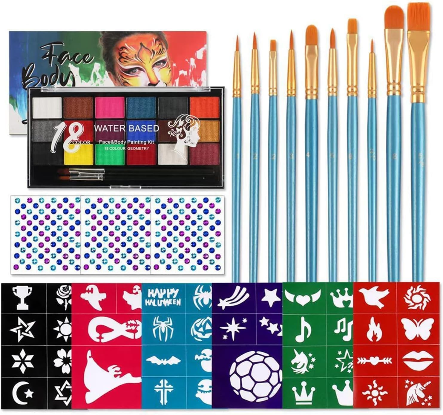 Blue Squid Face Painting Kit for Children – 18 Colors Kids Face Paint Kit Palette with Stencils & Guided Tutorial, Water Activated Non Toxic Washable Facepaint body set Halloween Party Makeup