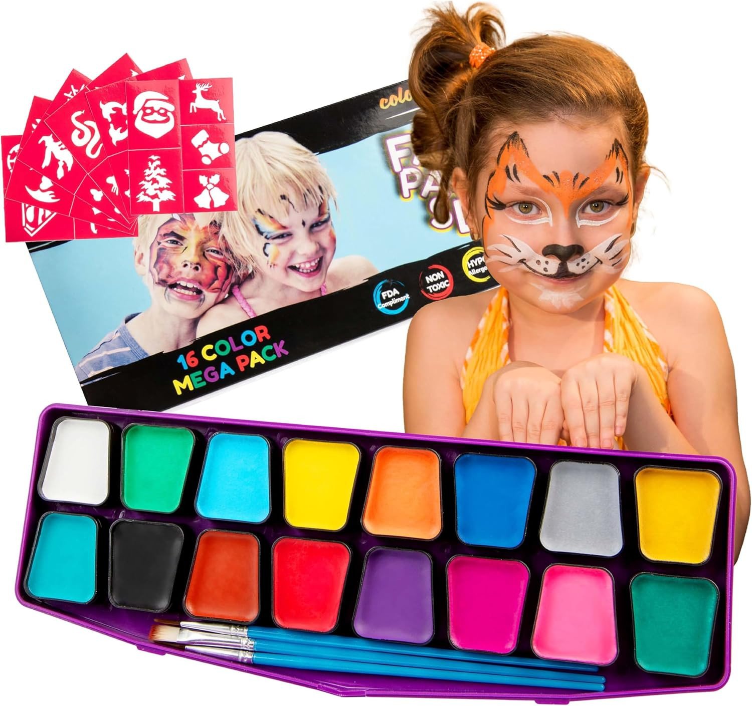 Colorful Art Co. Kids Face Paint Kit - Set of 16 Water-Based Professional Body and Face Paints w/ 3 Painting Brushes & 30 Stencils - Palette for Cosplay, Party and Halloween Makeup