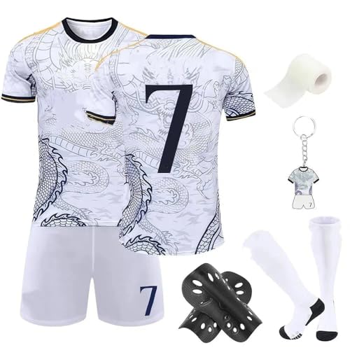 Amazluck Madrid #7 Football Kits for Boys Girls Kids, Football Training Shirts Shorts Socks Guard Plate Keychain Bracelets and Bandages, Gifts for Children White