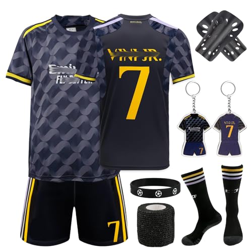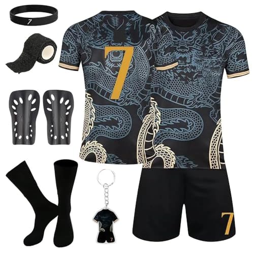 Football Kits for Kids, No.7 Home Away Soccer Jerseys Football Kit Football Training Set with Shorts Socks Guard Plate Keychain Bracelets Bandages for Kids Boys Girls(Black 24)