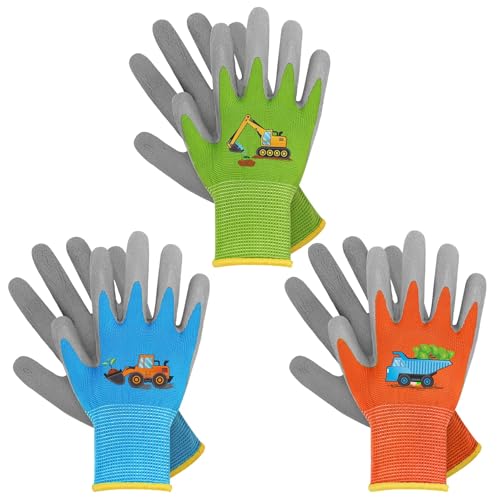 WAWSAM Kids Gardening Gloves 3 Pairs Toddlers Rubber Coated Work Gloves Children Garden Gloves Thorn Proof Heavy Duty Gloves Garden Working Gloves for Boys Girls Children Housework Duty Work