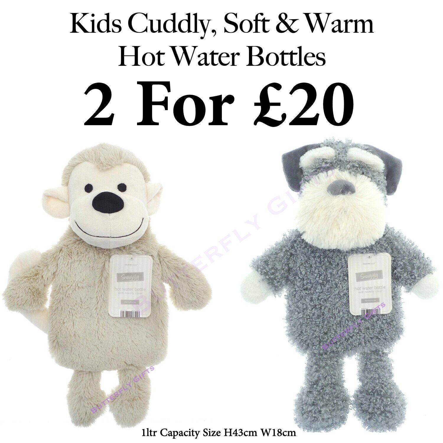 2 x Kids Hot Water Bottle Furry Animal Cuddly Soft Character Cover Novelty 1Ltr