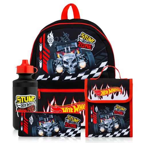 Hot Wheels Kids Backpack 4 Piece School Set Including Lunch Bag, Water Bottle and Pencil Case. Back to School Set