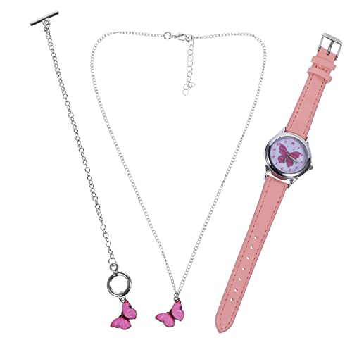 TOGEVAL Butterflies Pattern Quartz Wrist Watch with Pink Band, Matching Bracelet and Necklace Set for Girls, Kids Decorative Jewelry Gift for Birthday and School Use