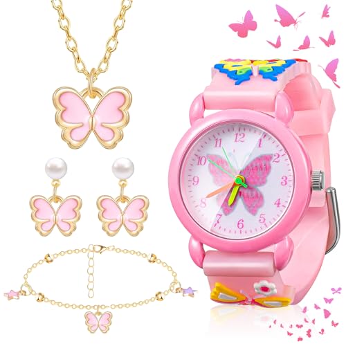 wlertcop Kids Watch and Jewelry Set - Girls Pink Cute Cartoon Butterfly Wrist Watches with Necklace, Bracelet, Earrings - Children's Birthday Gift, Children's Day Gifts, Kids Watch Pink 5 PCS