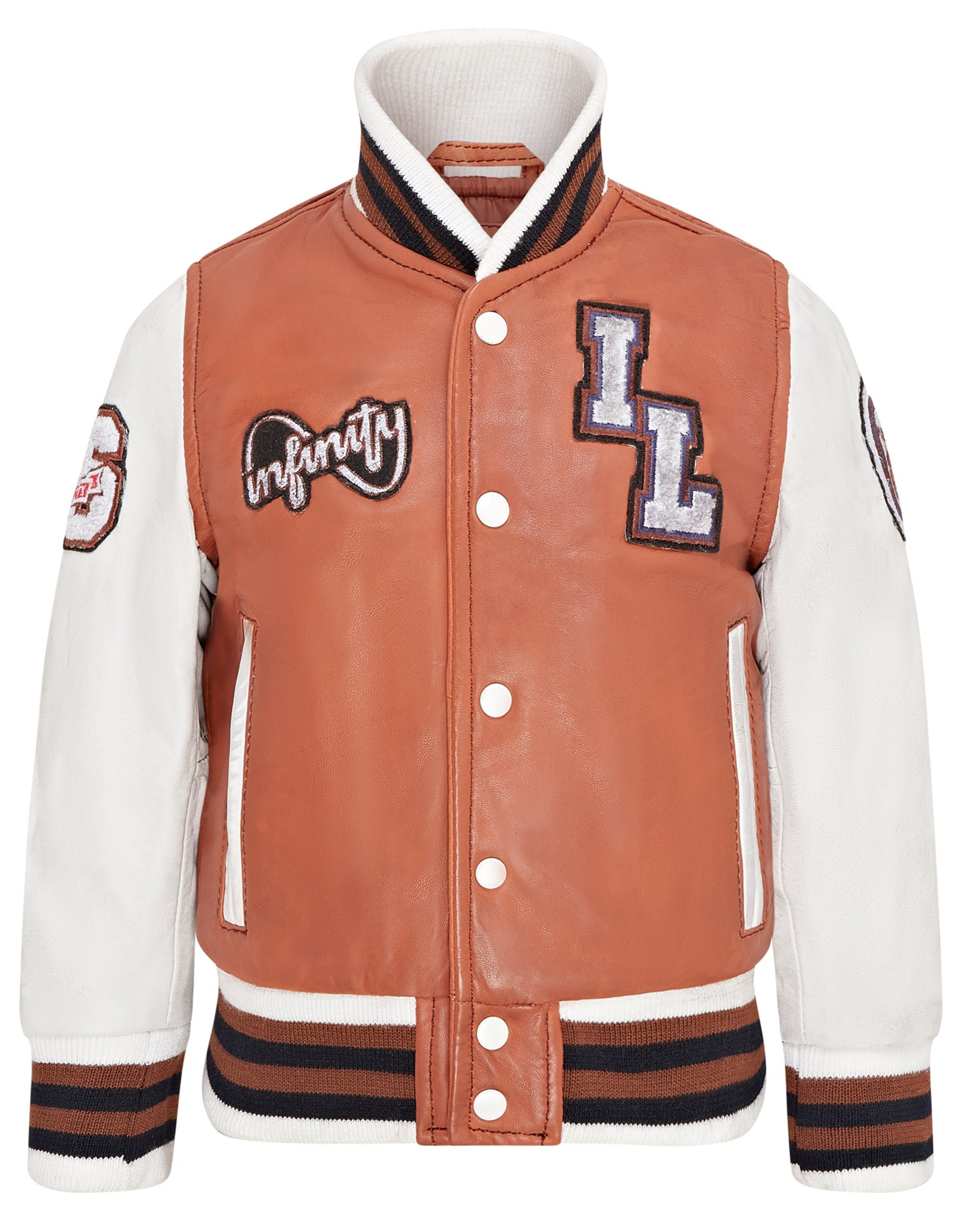 Infinity Leather Childrens Unisex Kids Letterman Varsity College Bomber Jacket - Tan Lamb Leather - Size 6-7Y