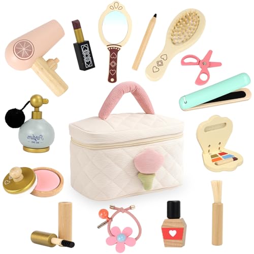 TUSEASY Wooden Kids Makeup Set, 16-Piece Pretend Beauty & Hairdressing Kit with Carry Bag, Water-Based Paint & Smooth Rounded Edges, Gift for Girls Ages 3–5