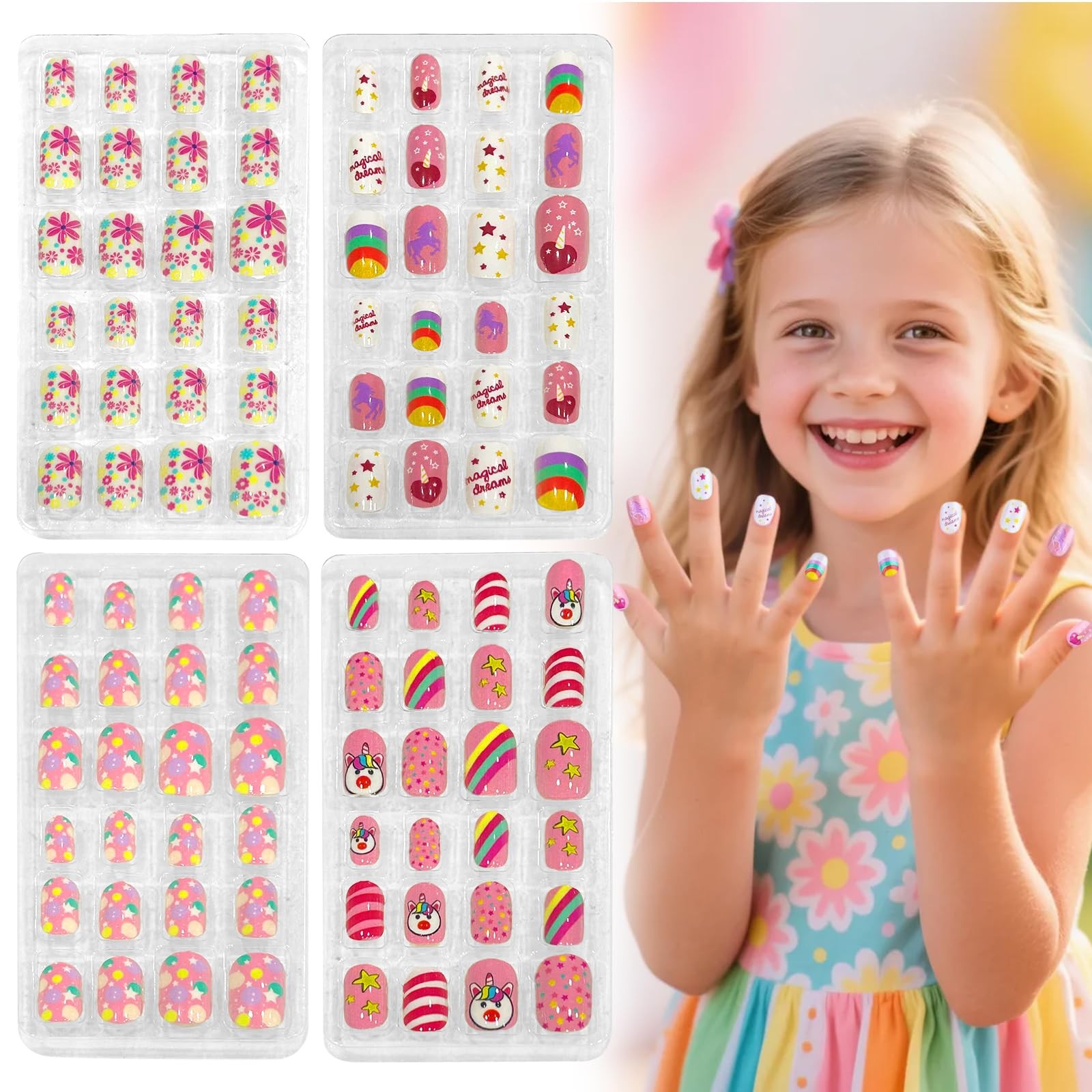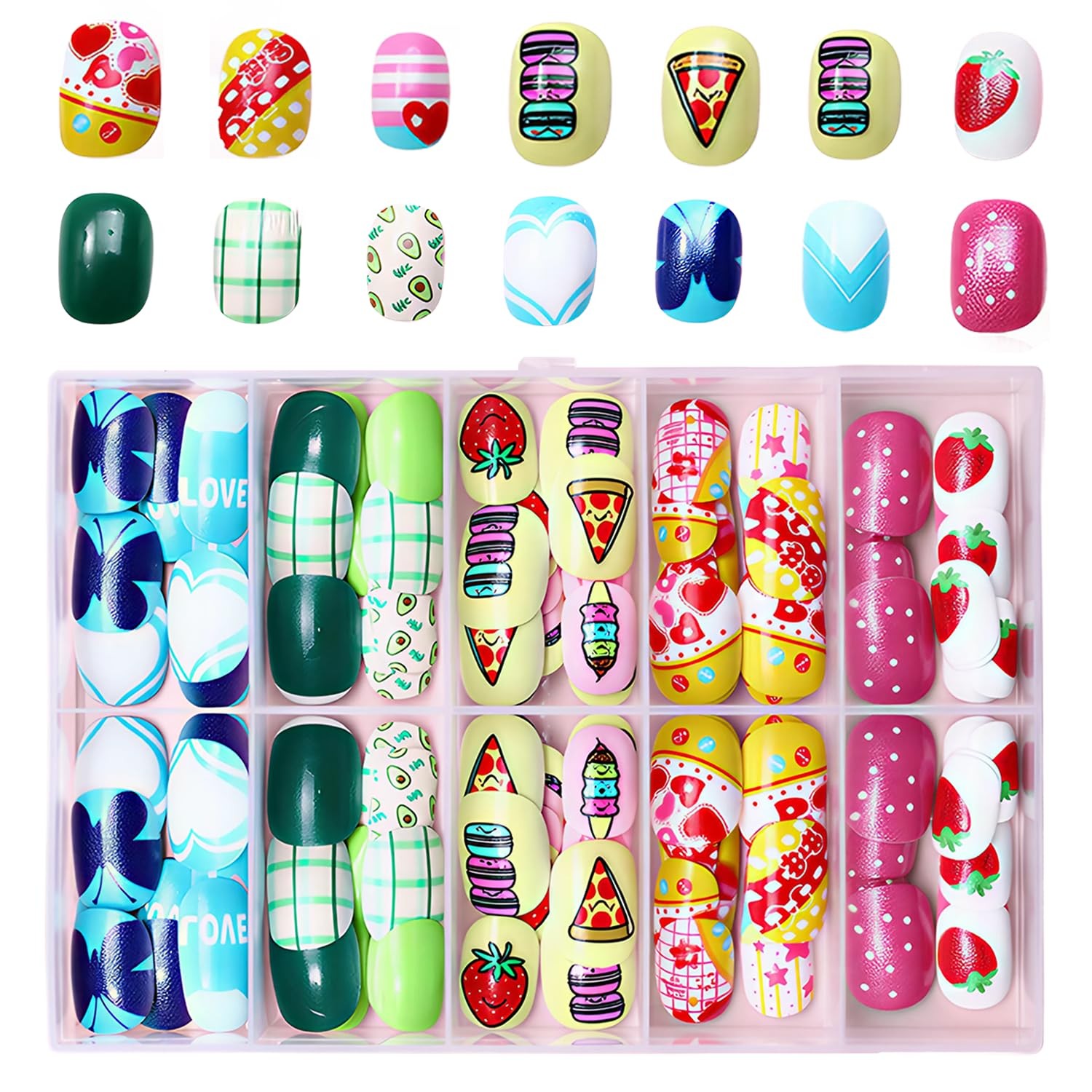 120 Pcs Press-On Kids Fake Nails Set with 4 Patterned Boxes for DIY Art