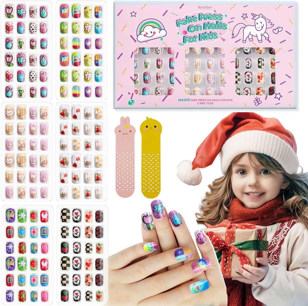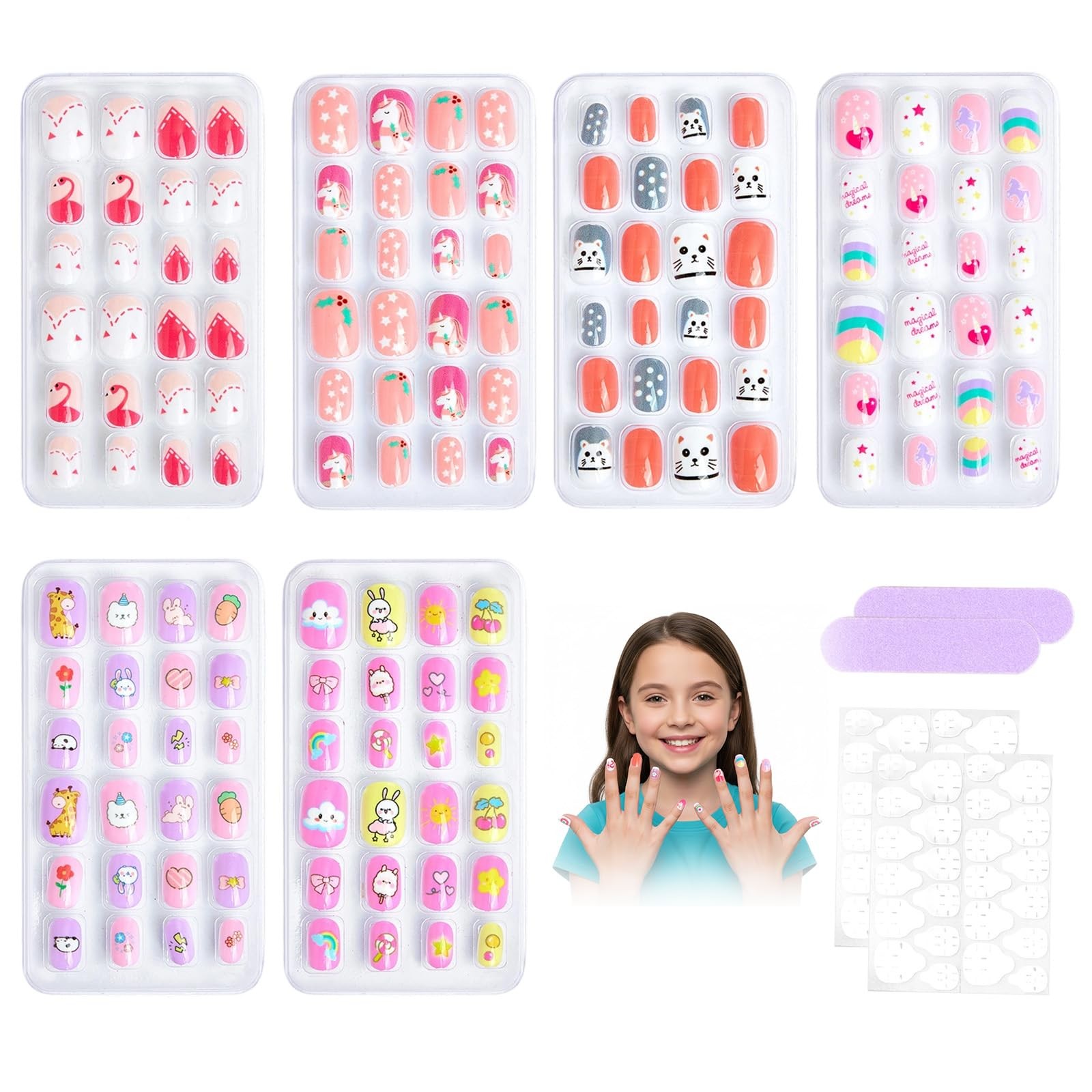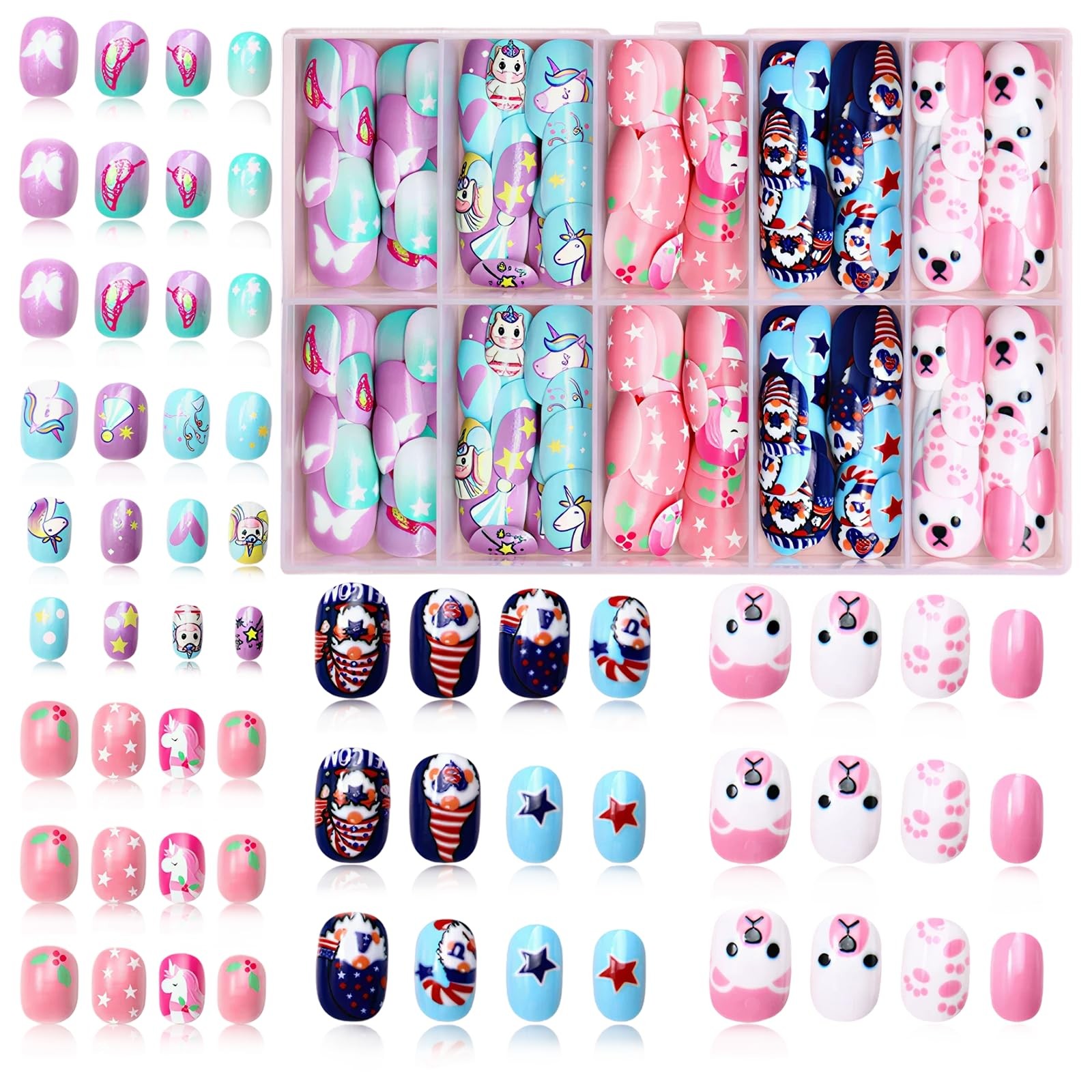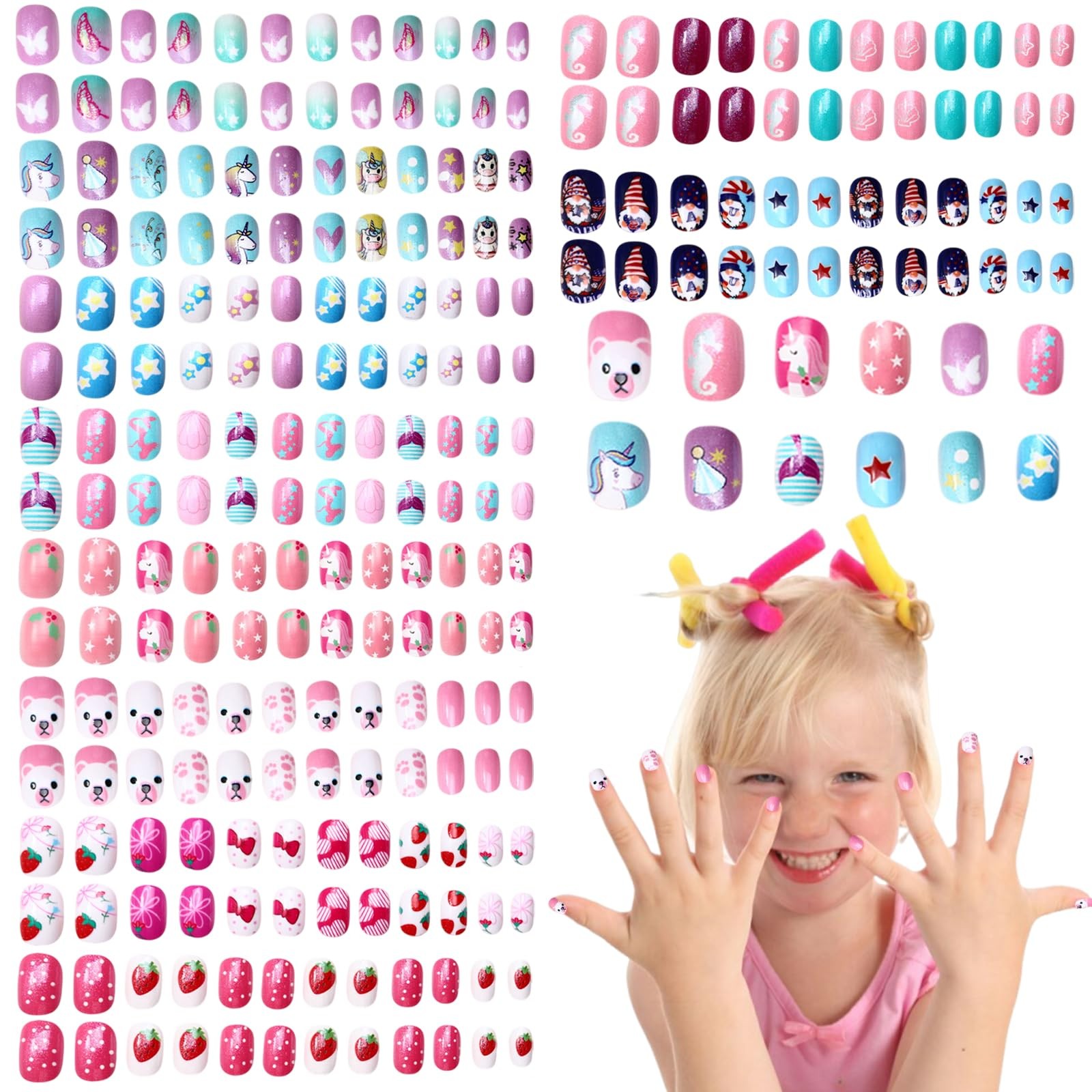 Kids Stick on Nails, 144 Pcs Cute Cartoon Fake Nails for Kids, Full Cover Childr
